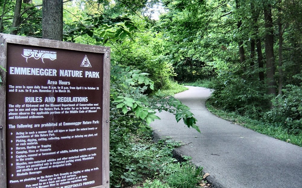 Emmenegger Nature Park features 93 acres of beautiful outdoor areas. Adjacent to the park, Possum Woods Conservation Area boasts an additional 15 acres. Over the past 100 years, this area has been used as a public swimming pool and tennis club. At one point, the St. Louis Zoo also used the area as an exotic animal breeding area. In the 1970s, Russell E. Emmenegger originally developed the land as a park. The layout features a diverse mix of hardwoods and land species. An area map and brochure can be found on their website.